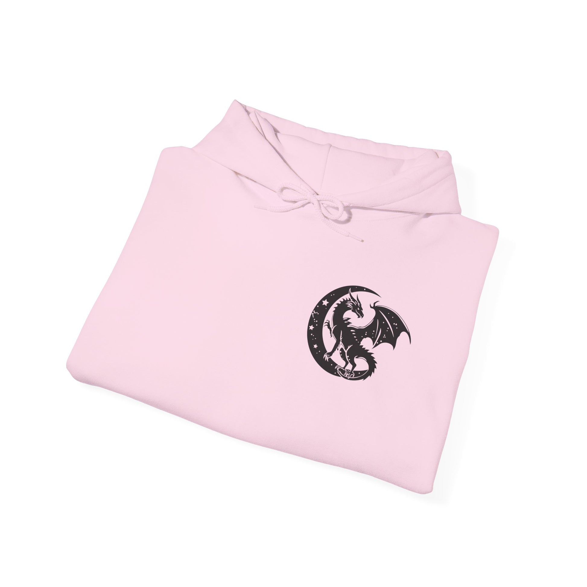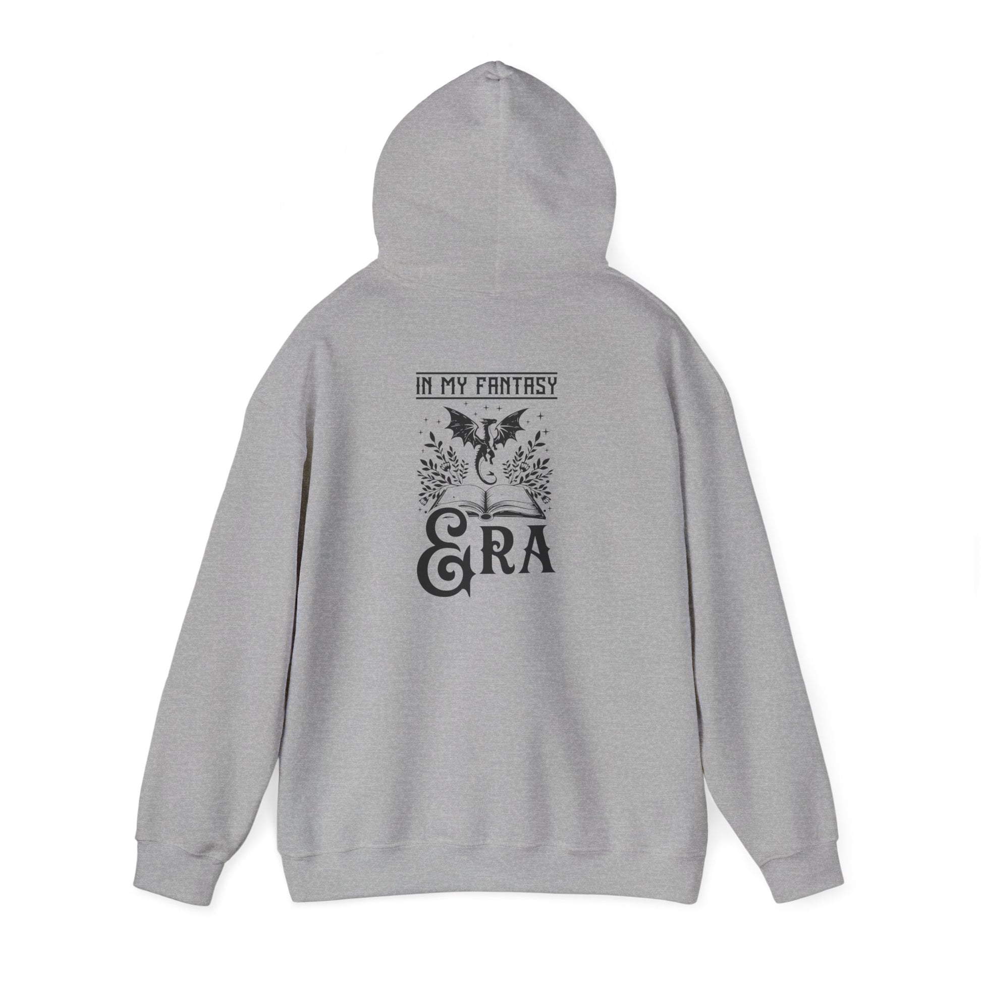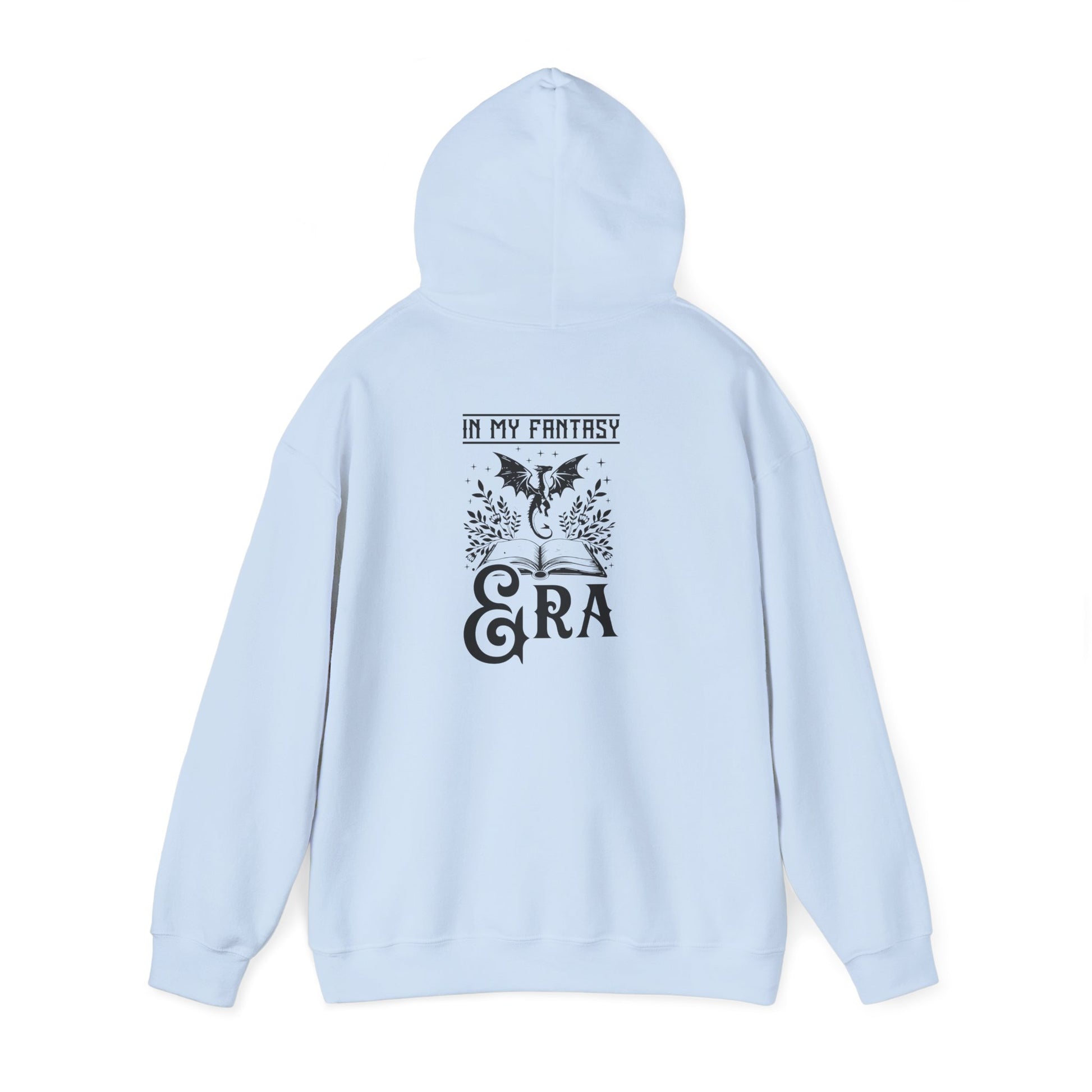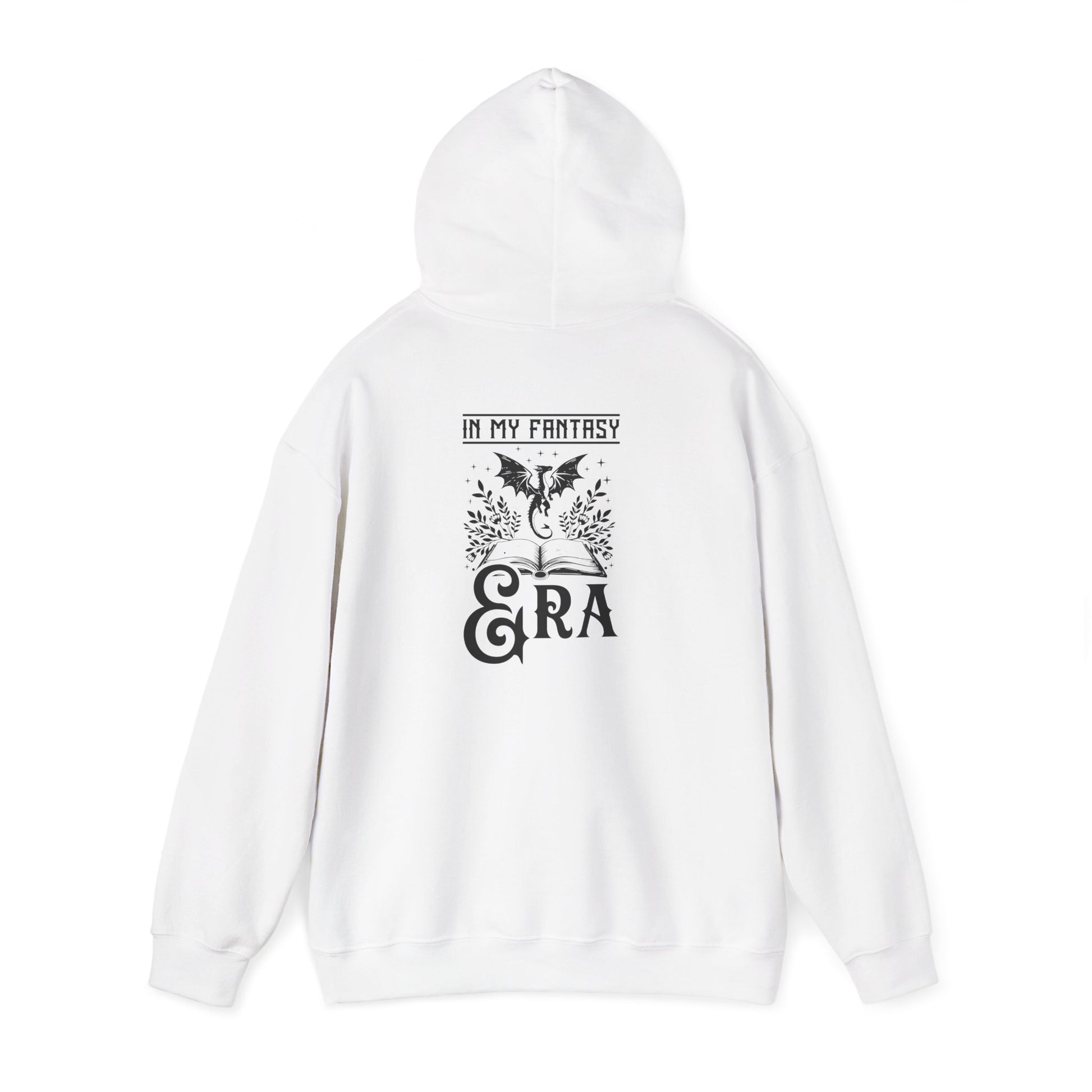 This hoodie features a dragon flying out from the pages of an open book on the back, with the text 'in my fantasy era', and a dragon silhouette in a moon on the front. It gives off a mystical and whimsical vibe, perfect for fantasy lovers and those who appreciate mythical creatures. Ideal for cozy evenings spent reading or watching fantasy movies. Relevant for fantasy-themed parties, cosplay events, and book lovers' birthdays.