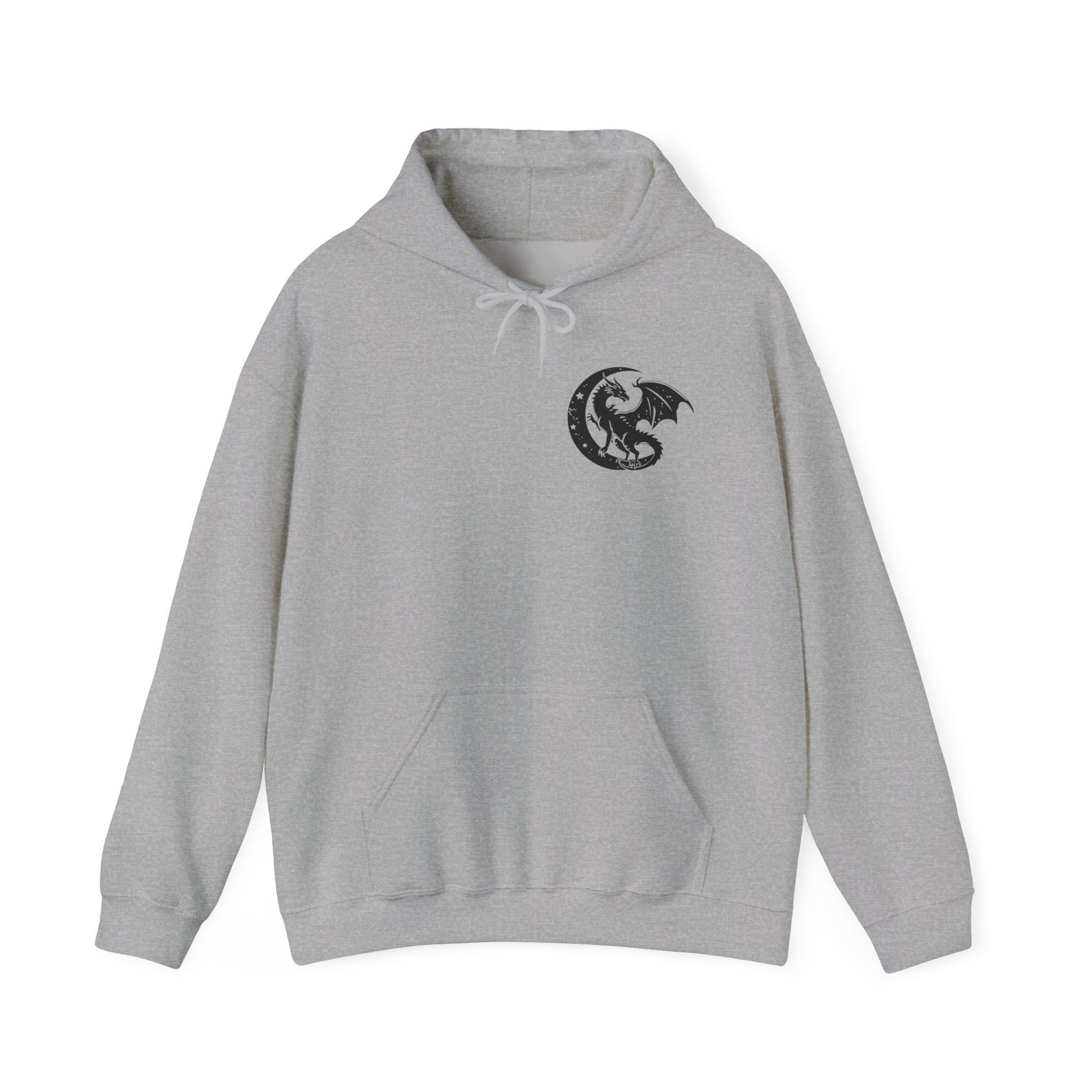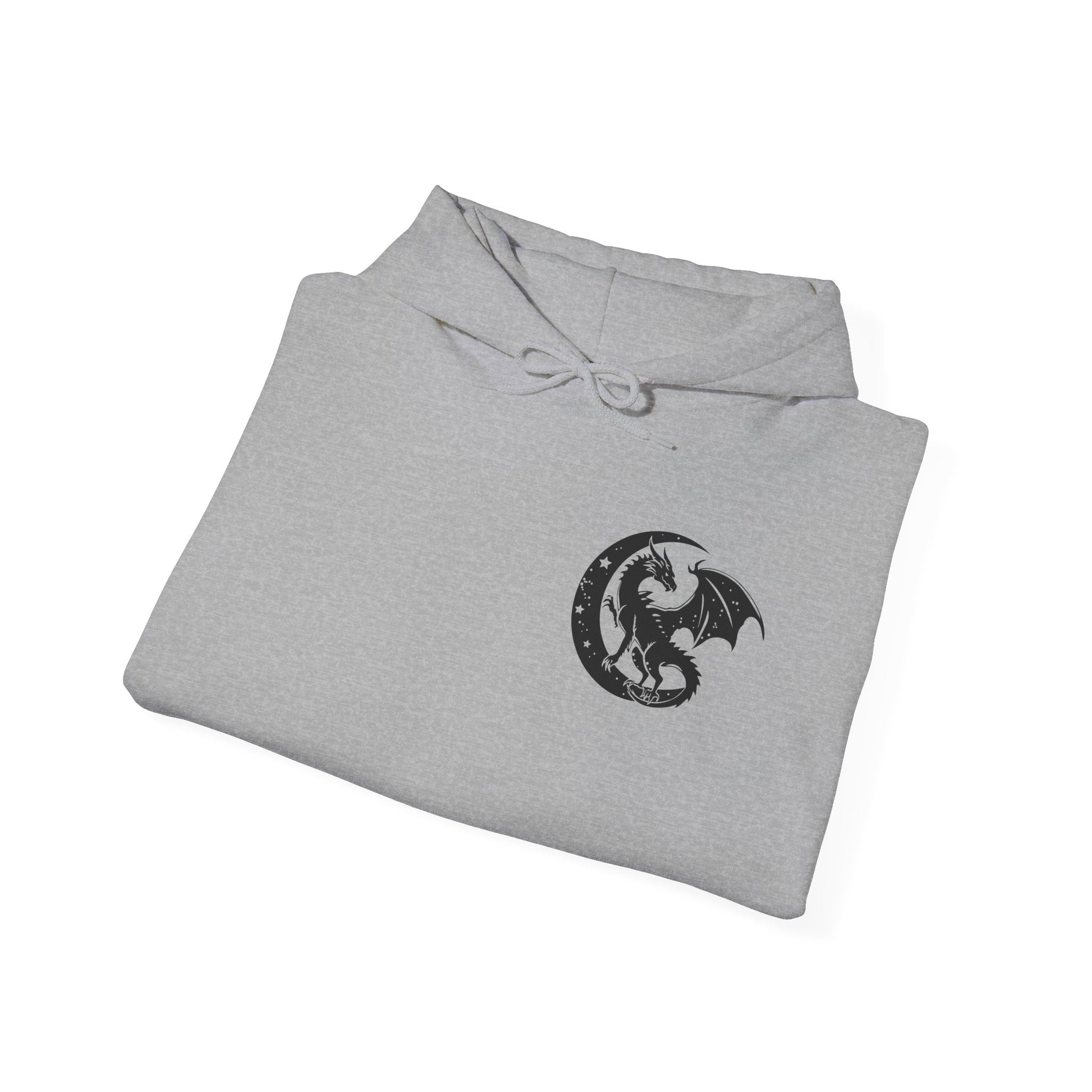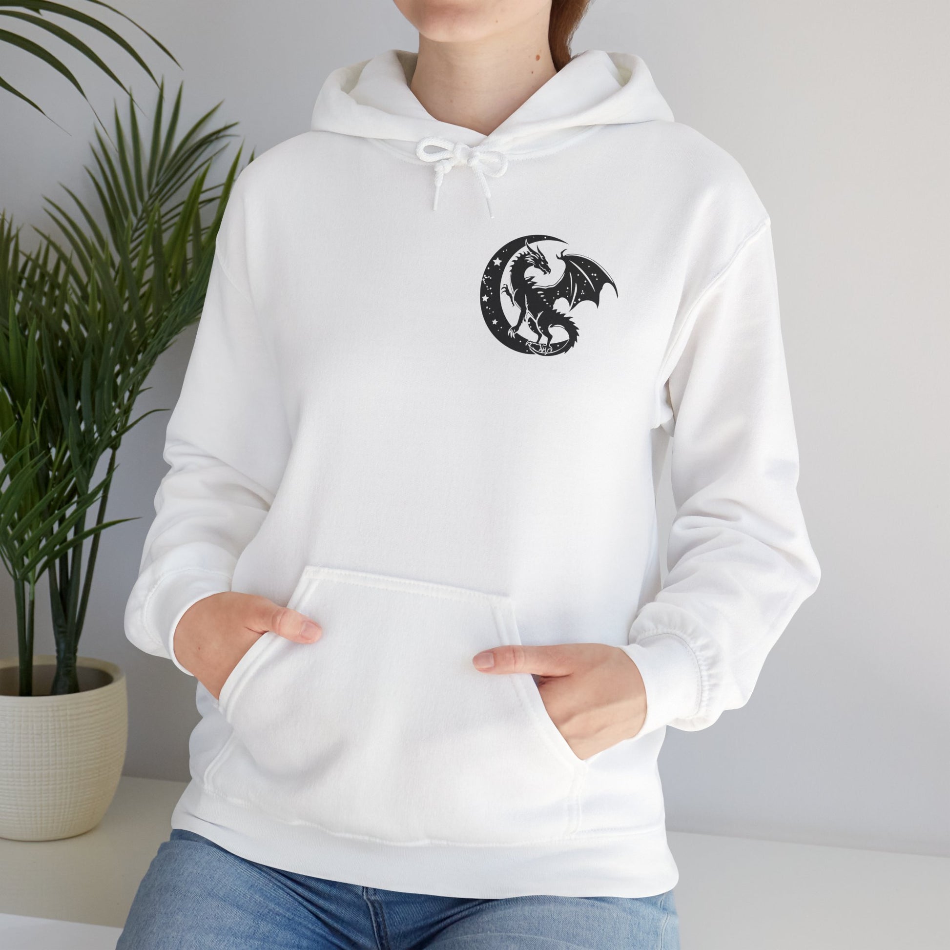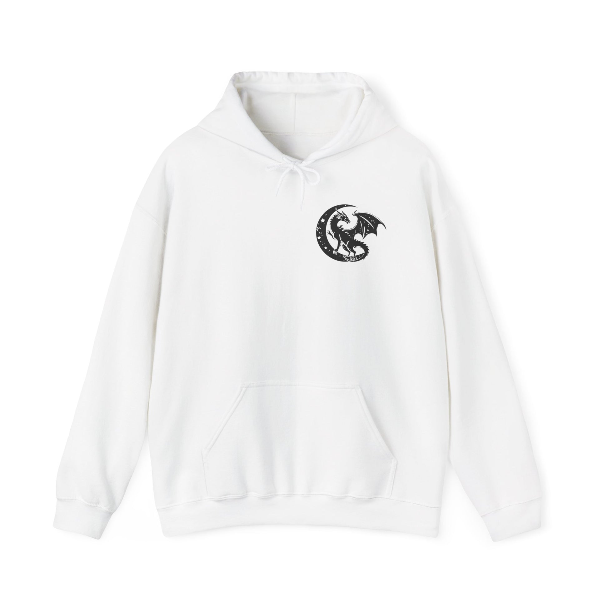 This hoodie features a dragon flying out from the pages of an open book on the back, with the text 'in my fantasy era', and a dragon silhouette in a moon on the front. It gives off a mystical and whimsical vibe, perfect for fantasy lovers and those who appreciate mythical creatures. Ideal for cozy evenings spent reading or watching fantasy movies. Relevant for fantasy-themed parties, cosplay events, and book lovers' birthdays.