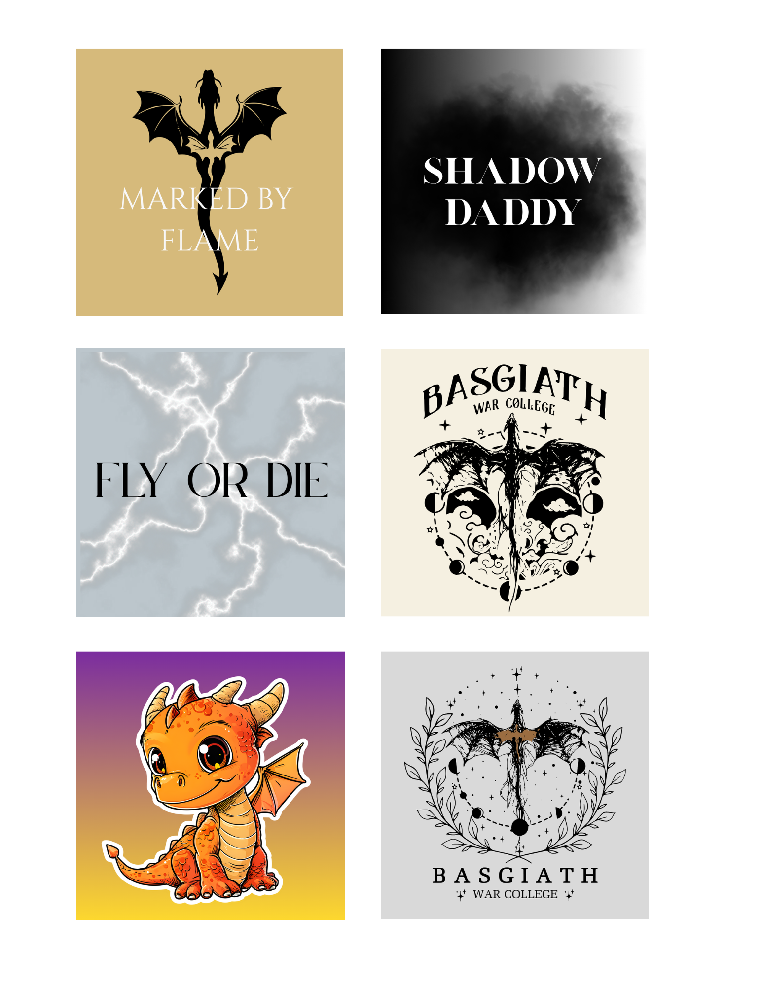 Let your gear shout “Fly or Die” with this bold bundle of dragon-approved stickers. Inspired by the stormy skies and deadly halls of Basgiath, these five high-quality vinyl stickers channel the lightning, rebellion, and rider grit from the Empyrean series.