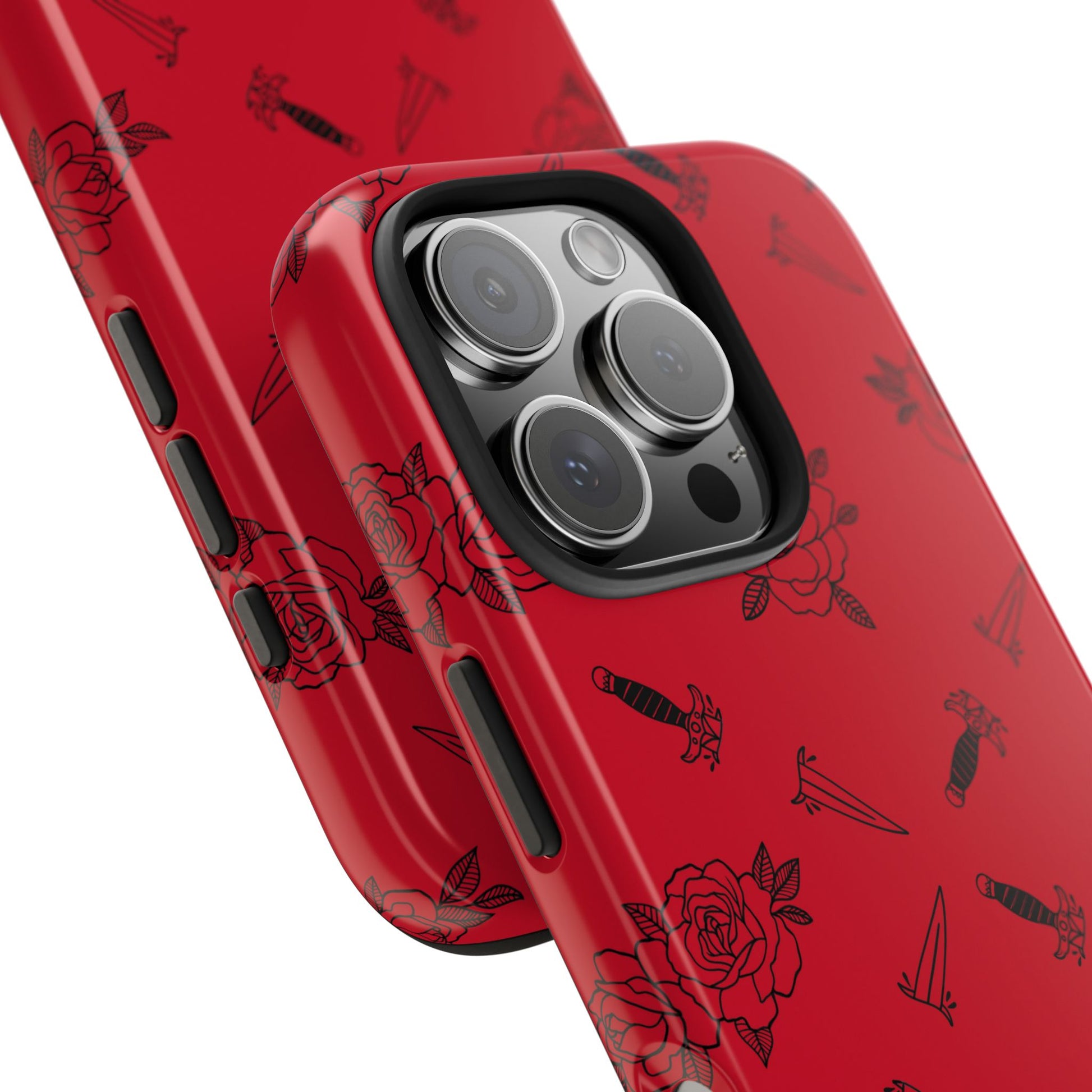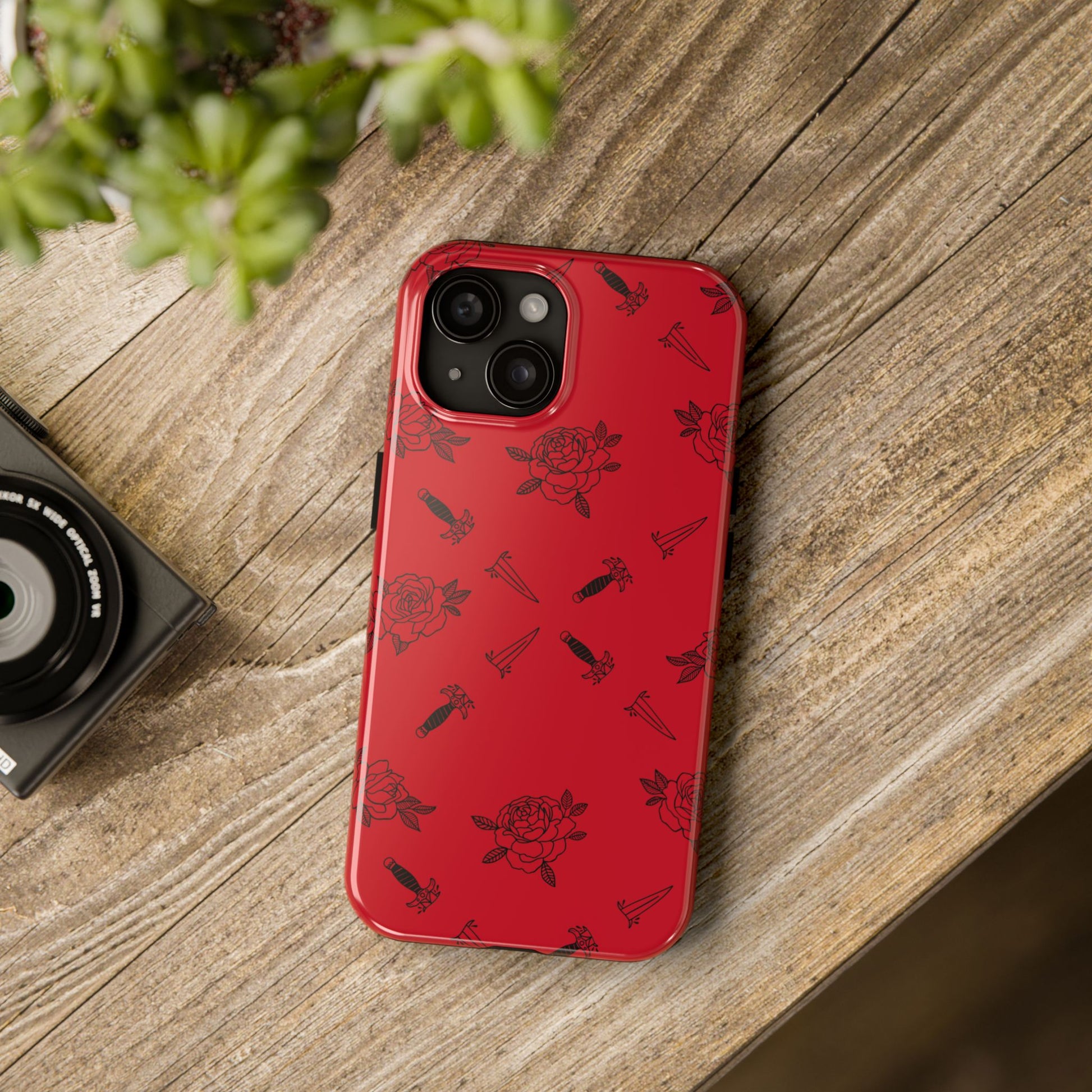 A slim, glossy phone case that pairs bold color with subtle edge. The deep red background is scattered with delicate black line illustrations—roses, small daggers, and feathers—giving a balance of romance and rebellion. The hard polycarbonate shell and soft TPU liner work together to disperse shocks while a lay-flat bezel keeps the screen raised from surfaces. UV protection keeps the finish vivid outdoors, and the glossy coating catches light to highlight the design. It feels sturdy in hand but not bulky, a daily piece that shows a curated, slightly dark aesthetic without shouting.