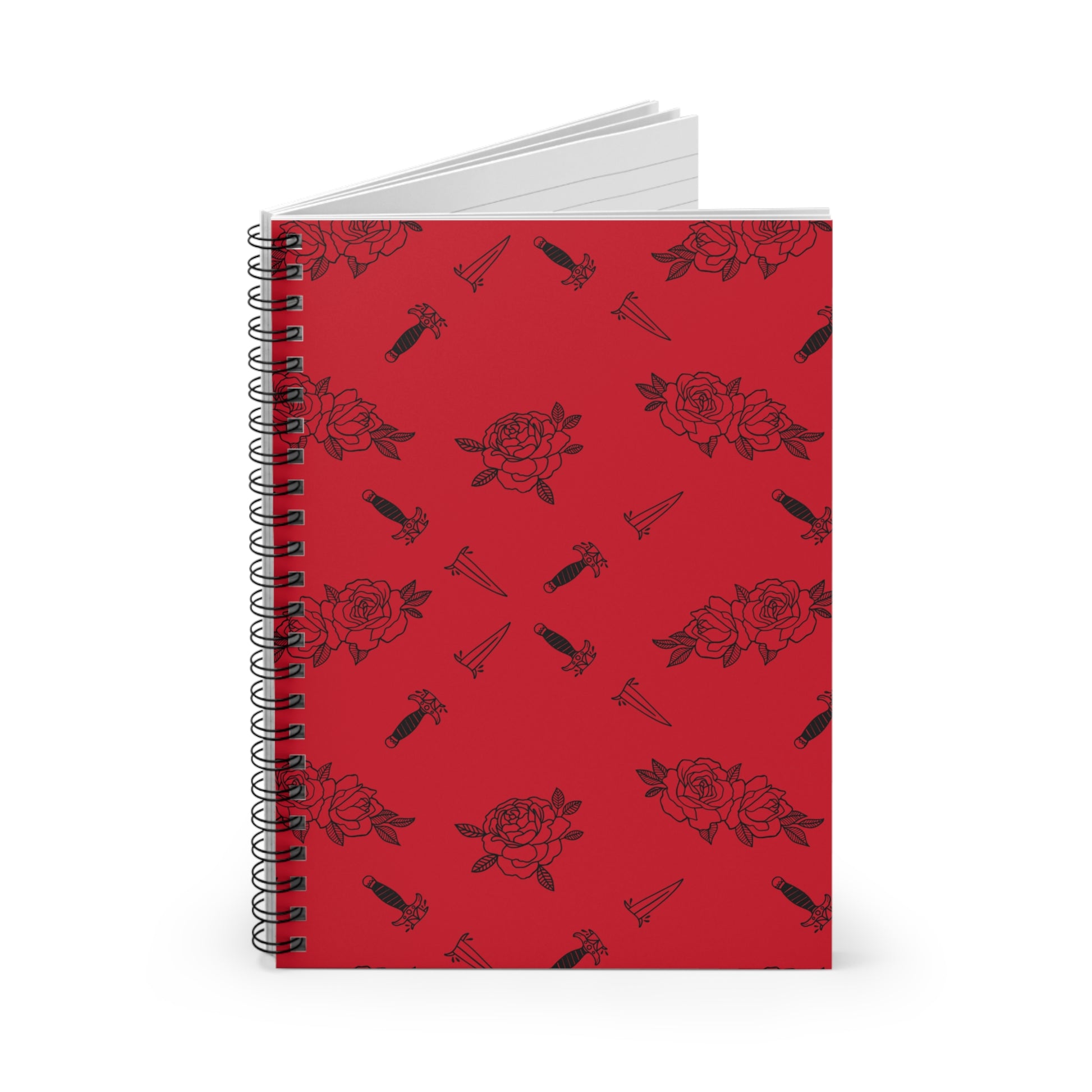 A crimson notebook with a moody, tattoo-inspired print — black roses, daggers, and small motifs scattered across the front cover. The metal spiral lets the pages lie flat and makes tearing out notes simple. Inside, smooth 90gsm ruled pages invite long-form thoughts, lists, and sketches, while a hidden pocket in the back keeps receipts and loose papers secure. Compact at 6" x 8", it slips into bags easily and becomes a daily companion for journaling, planning, or collecting ideas with a touch of edge.